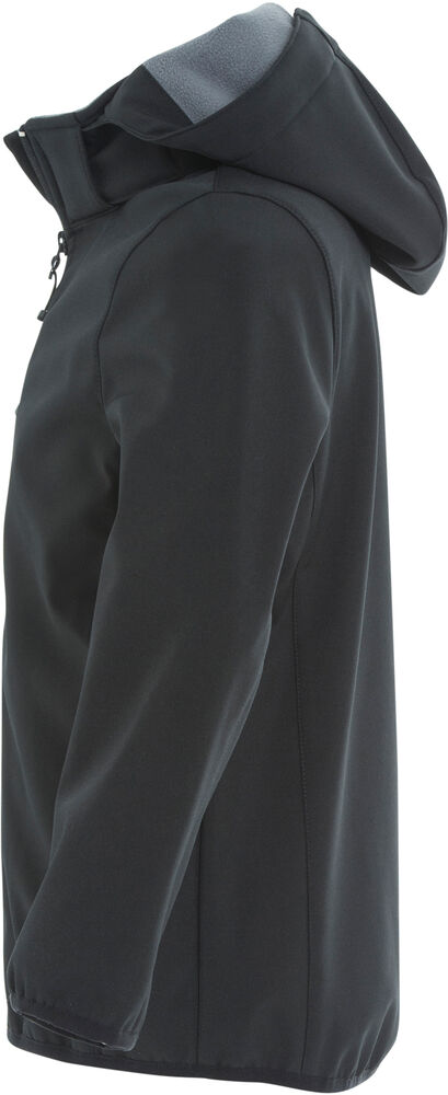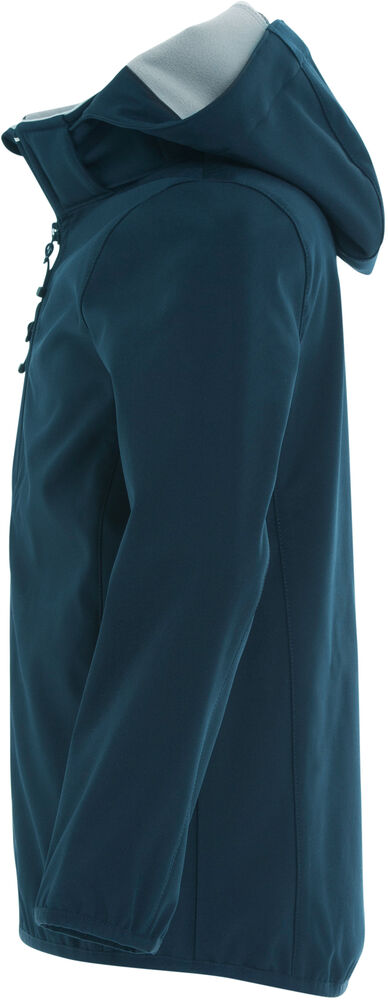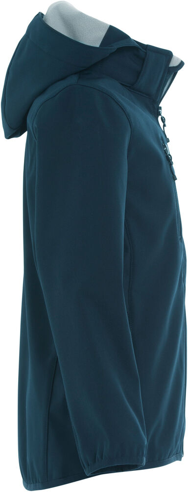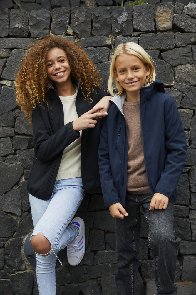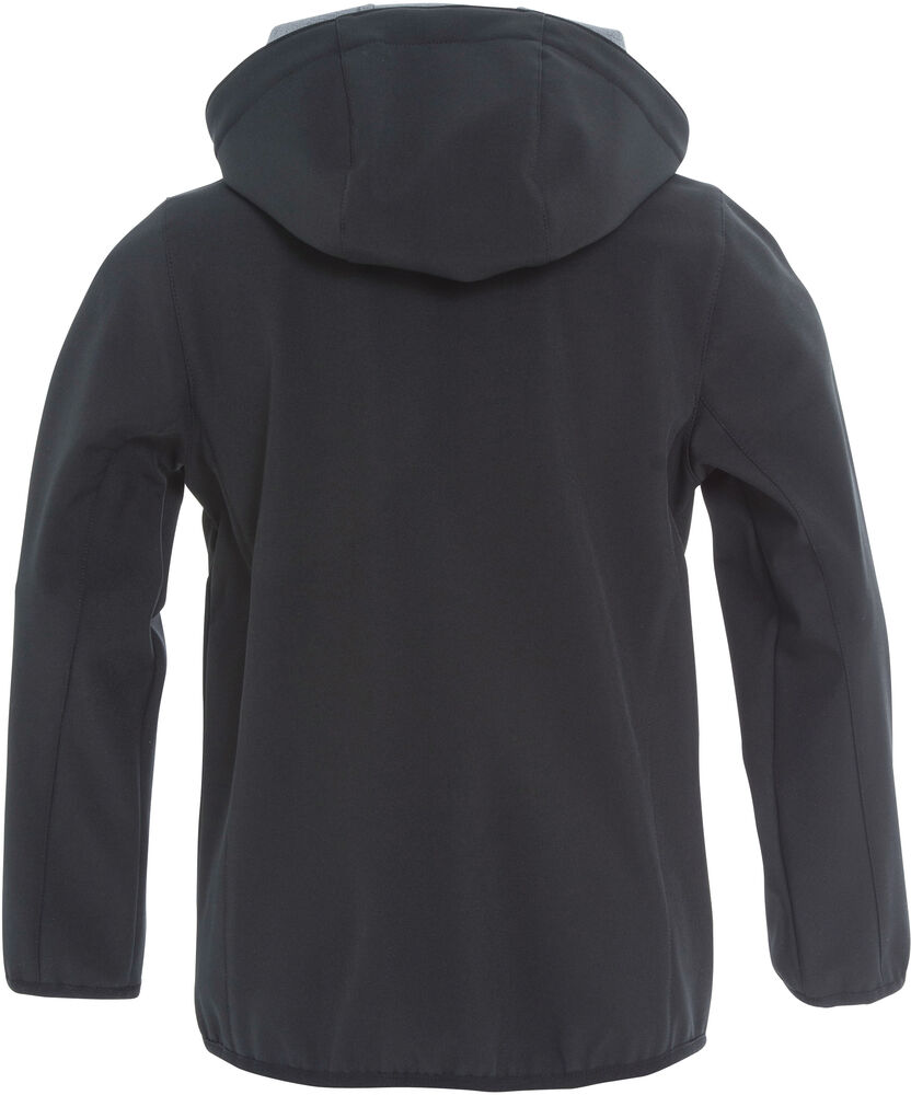 Softshelljacka i barnmodell. Tre fickor på utsidan av jackan samt 2 innerfickor. Dragkedjor ton-i-ton, elastiskt band nedtill och i ärmslut. Avtagbar huva.