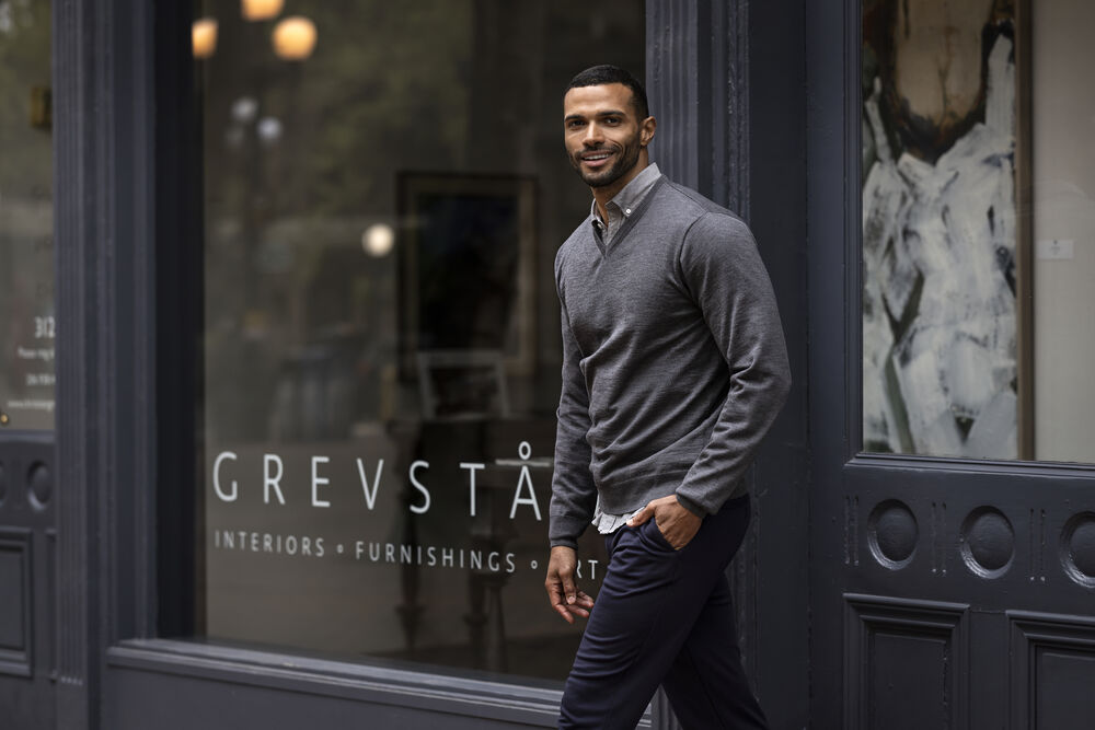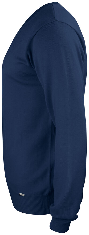 Modern v-ringad stickad tröja, designad i följsamt material.