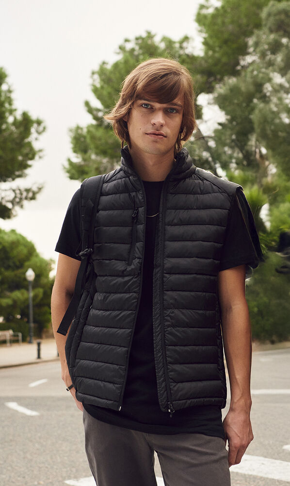 Modern lättvadderad väst. Tre fickor med dragkedjor samt två innerfickor. Hörlursögla på insidan av halsöppningen.