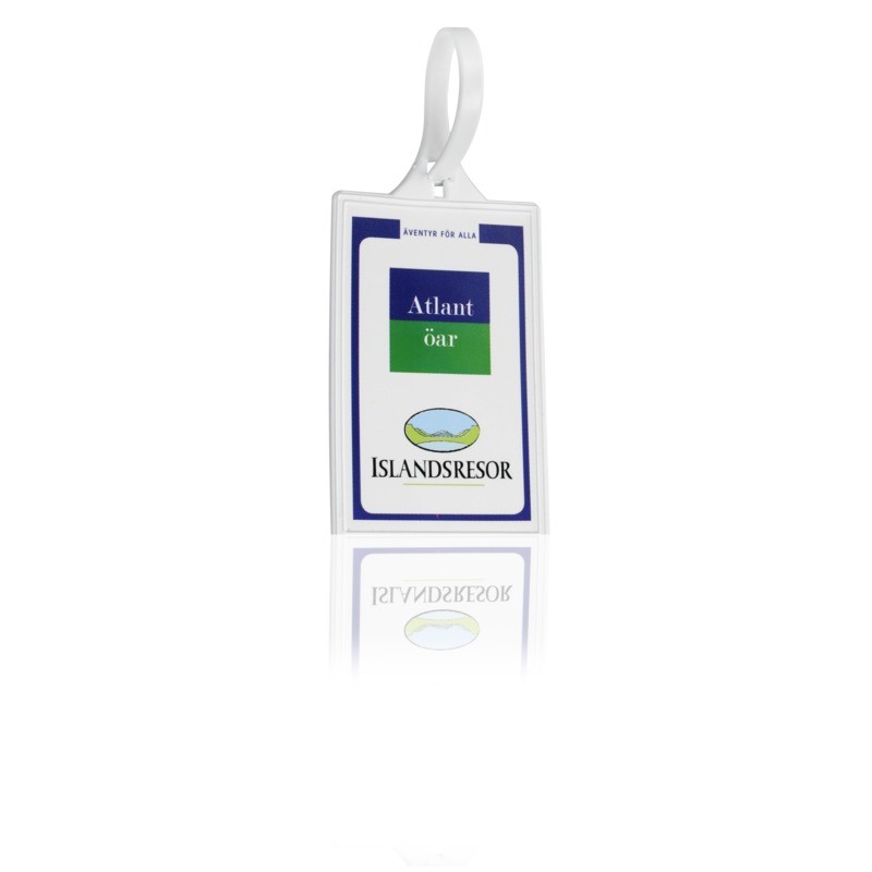 Märk din bag eller väska med namn och adress. Rektangulär bricka med inbyggd rem. Engelsk text på namnfältet. Mått: 83 x 54 mm. Max tryckyta: 71 x 43 mm.