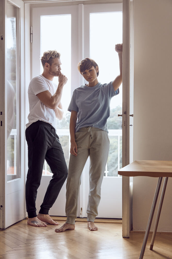Vår finaste träningsbyxor i ekologisk bomull och återvunnen polyesterblandning. Lite bredare avslut i midjan samt nedtill i benavslut ger ett snyggt och modernt intryck. Snörning i midjan med metallavslut. CVC French Terry på insidan, fiskbensmönstrad förstärkning i benavslut samt elastisk 1×1 rib. Byxan har en bakficka med YKK dragkedja.