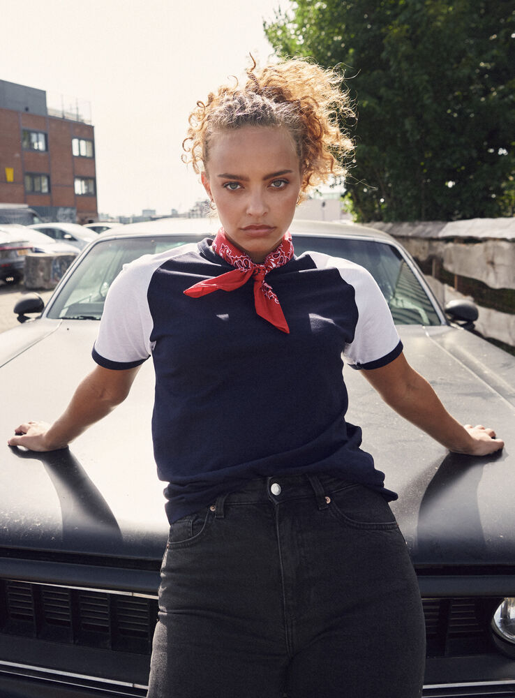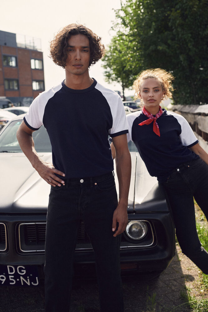 Tvåfärgad t-shirt med raglanärm i single jersey. Hals- och ärmavslut med elastan.